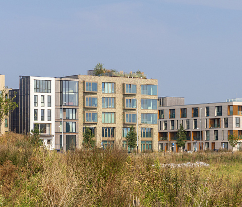 Aan de Strandeilandlaan op kavel 14-09 op Centrumeiland met zicht op het water en de natuur van de Diemer Vijfhoek realiseert Van Bekkum voor de CPO bouwgroep ‘Young Creatives’ 30 casco woningen.